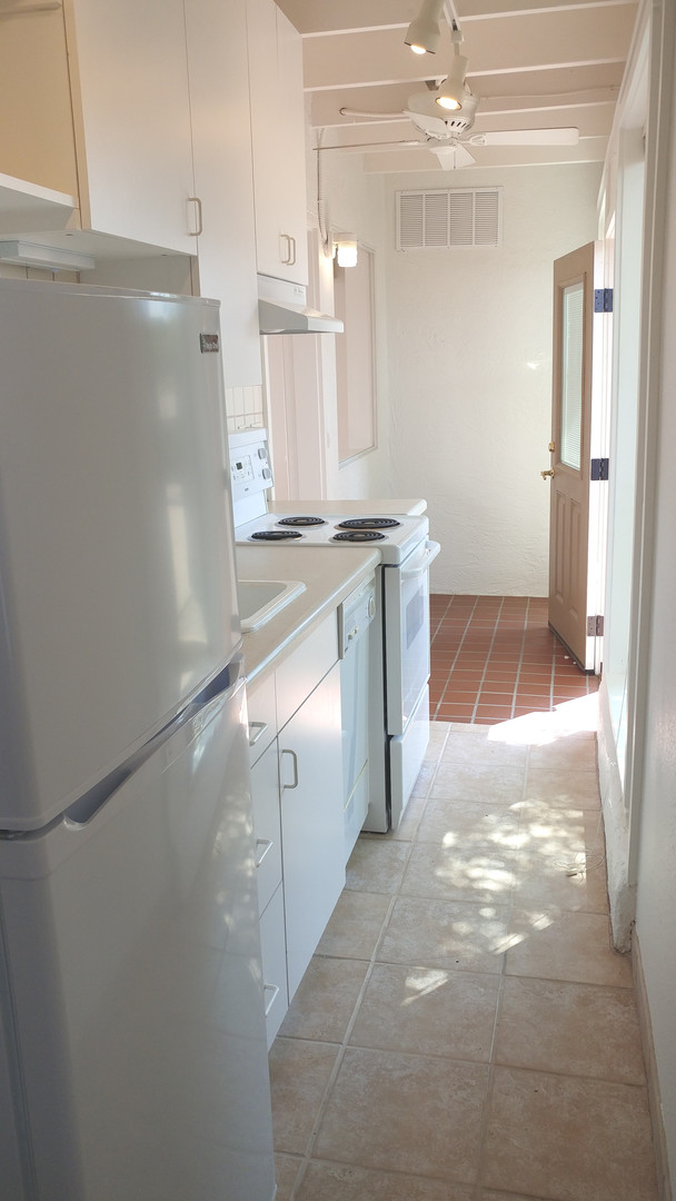 The galley kitchen is equipped with an electric stove and oven, refrigerator, track lighting, and two large windows overlooking the patio. The spacious bedroom includes three windows, an area suitable for a study or reading nook, and an extra-large walk-in closet. The bathroom features a skylight and a tub/shower combination.