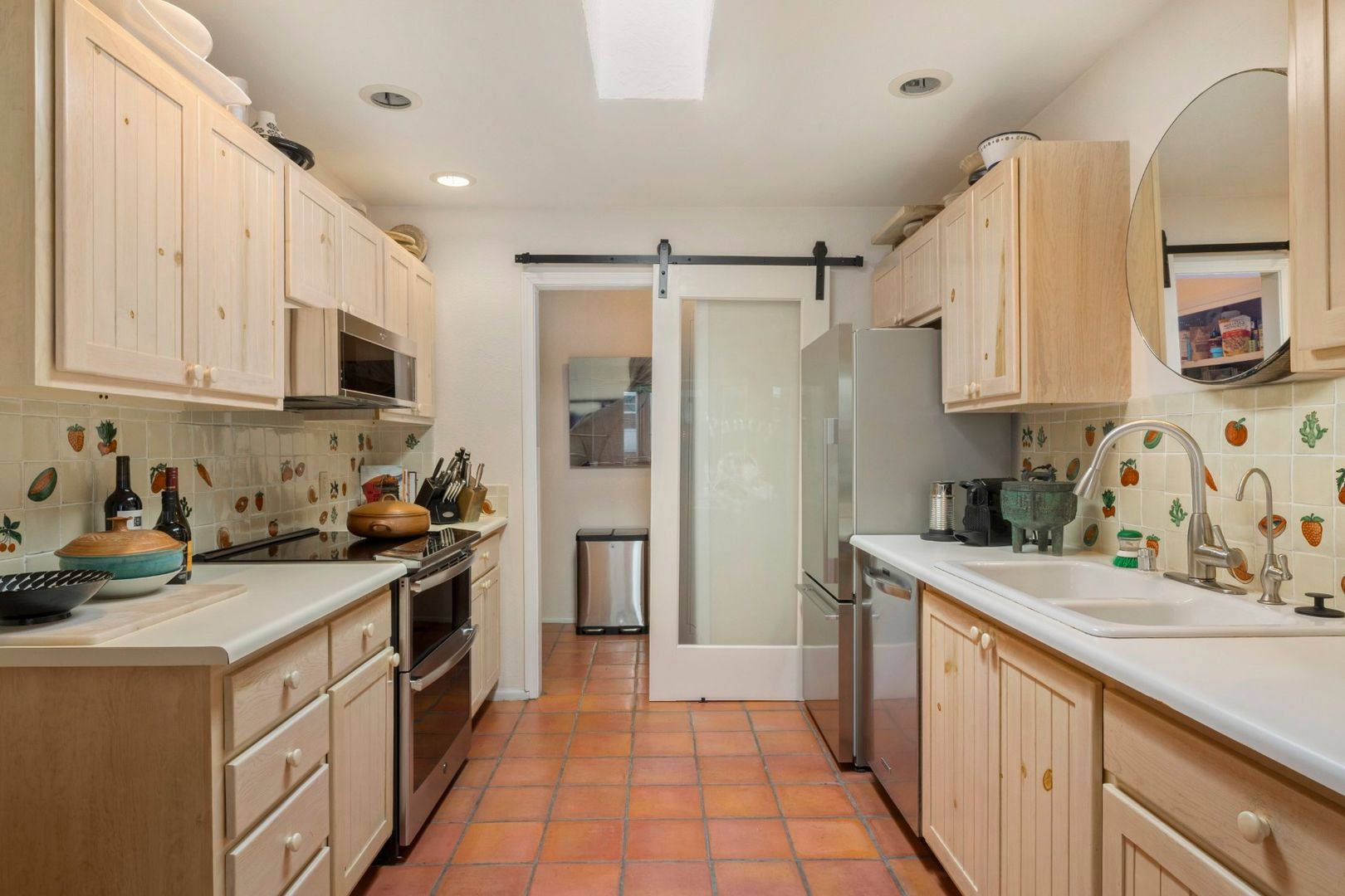The living area features an updated fireplace designed for easy use and maintenance, complete with glass coverings for enjoying the fire. Skylights throughout the living room, dining room, kitchen, and entryway bring in abundant natural light, complemented by light colored pickled ceiling beams that enhance the airy feel of the home. With an eastern orientation, the home is filled with natural light and offers lovely scenic views throughout the day.