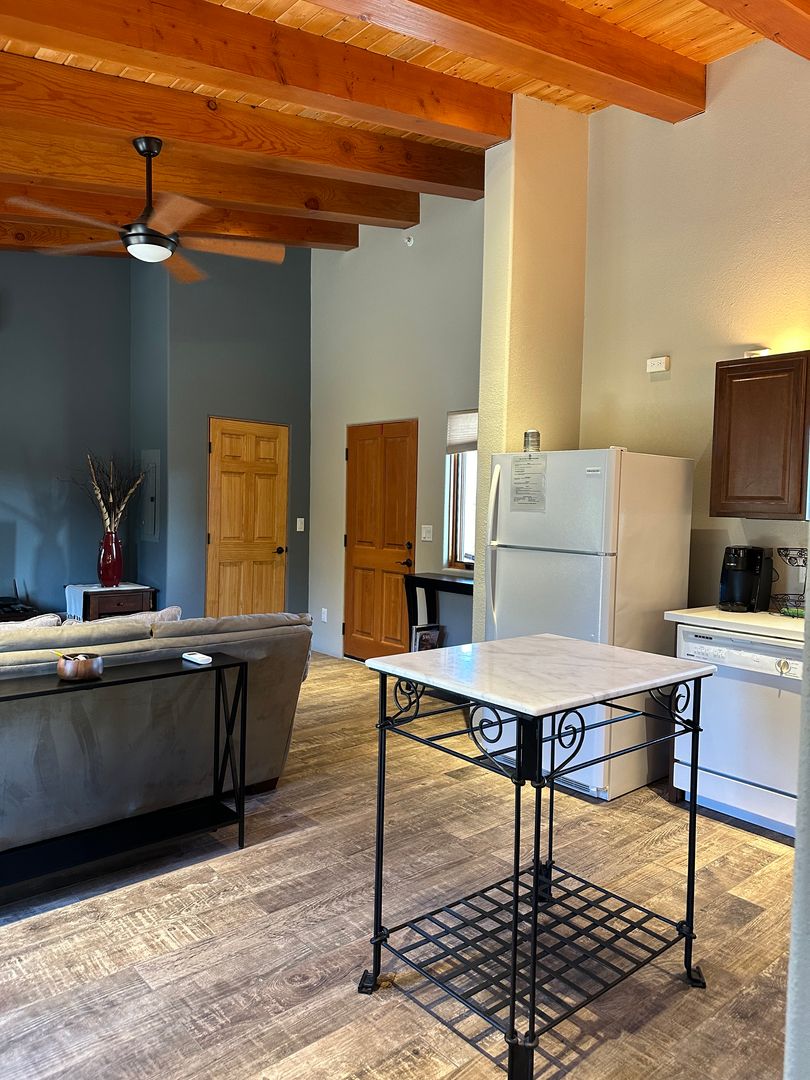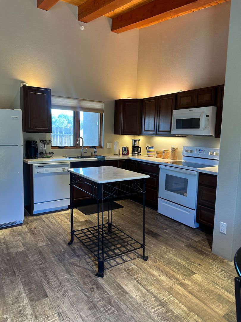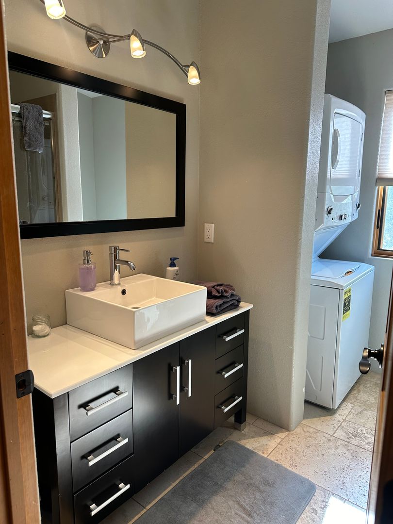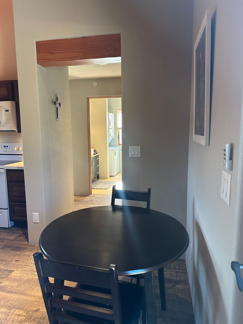This delightful detached casita is available either partially furnished or unfurnished. It boasts an open layout that seamlessly combines the living, dining, and kitchen areas. The space includes one bedroom and a bathroom equipped with a glass shower, along with a stackable washer and dryer.
