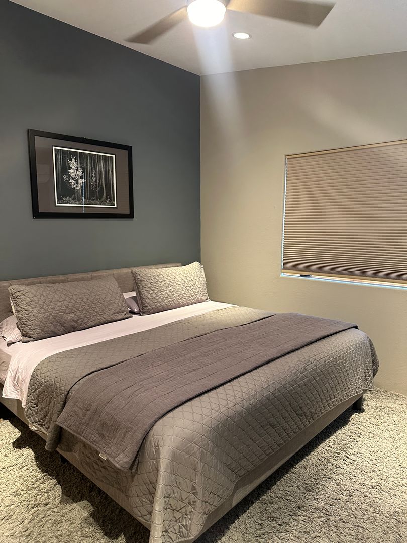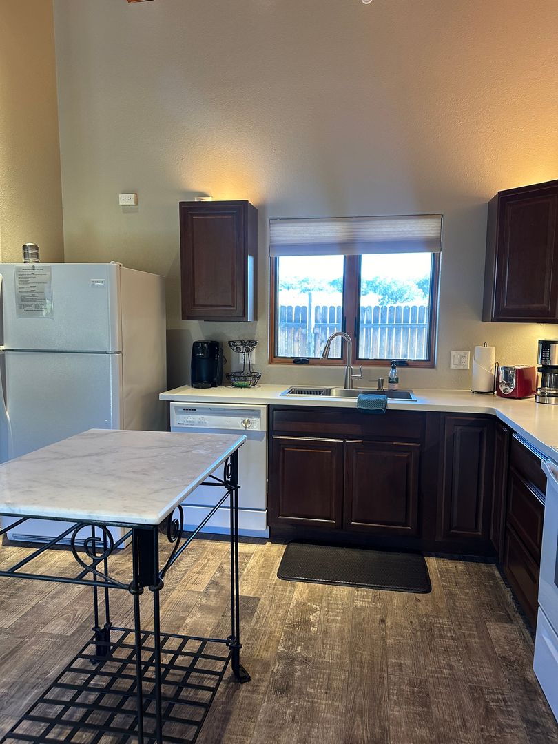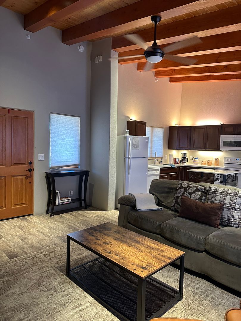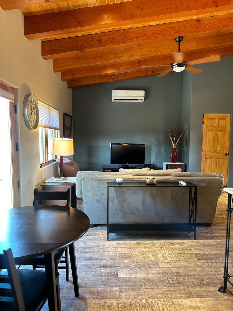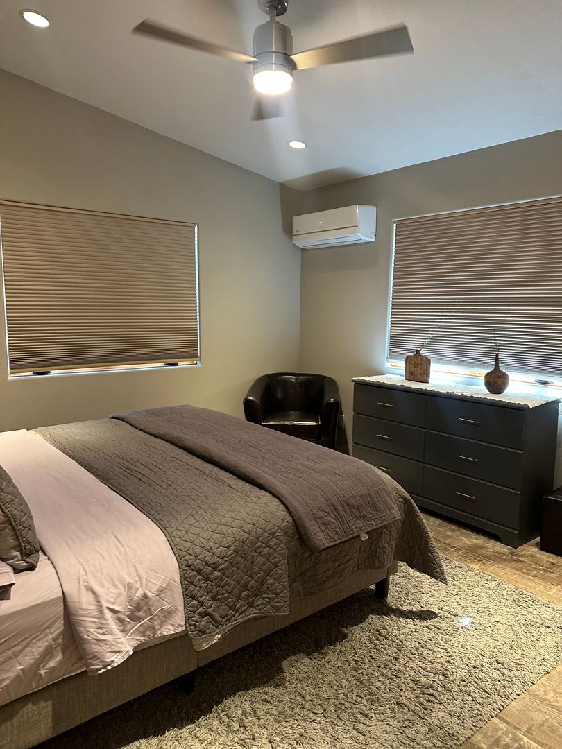 This delightful detached casita is available either partially furnished or unfurnished. It boasts an open layout that seamlessly combines the living, dining, and kitchen areas. The space includes one bedroom and a bathroom equipped with a glass shower, along with a stackable washer and dryer.