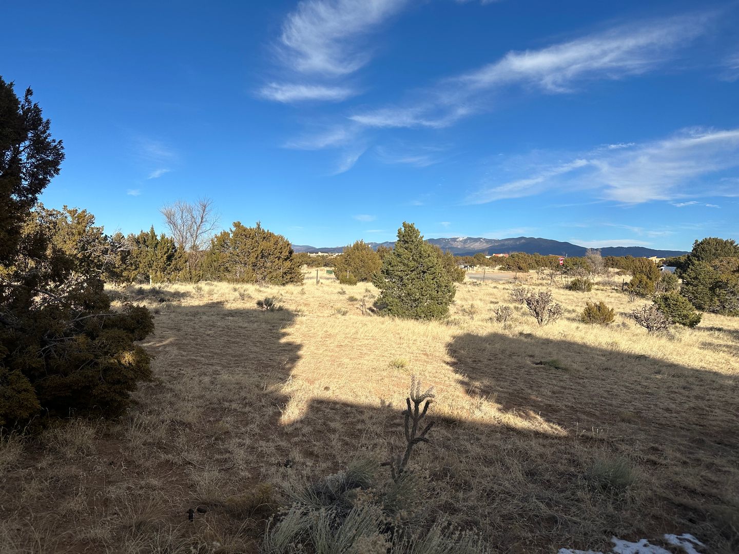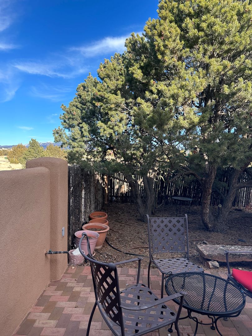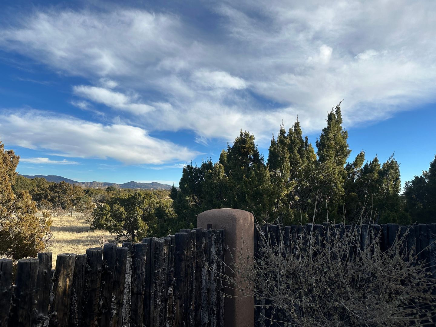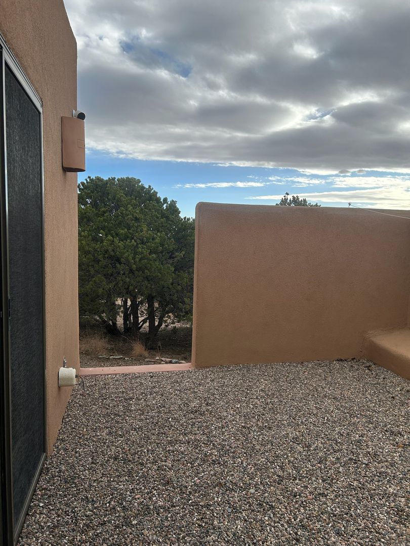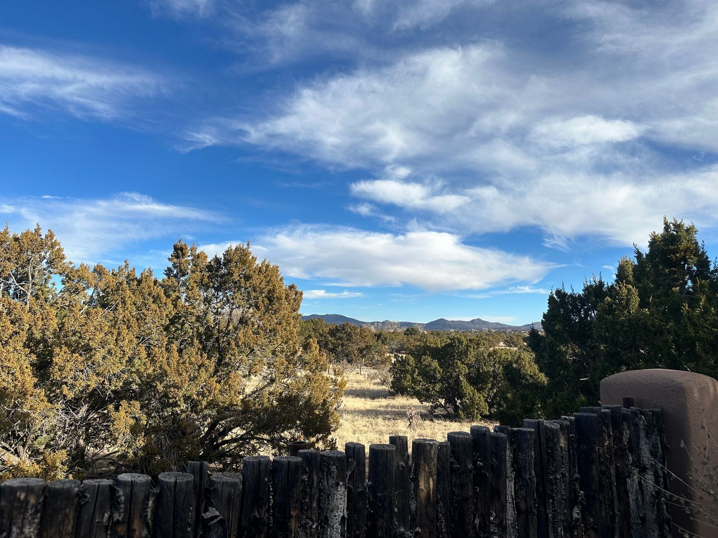 This charming Santa Fe-style stucco home features three bedrooms and two bathrooms, encompassing 2,280 square feet on a serene three-acre wooded lot. It includes an attached two-car garage, a cozy wood fireplace, and two secluded enclosed courtyards. The eastern courtyard and the living and dining areas offer stunning views of the Sangre de Cristo mountains, while the covered portal provides a perfect vantage point for the breathtaking sunsets over Sandia mountain.