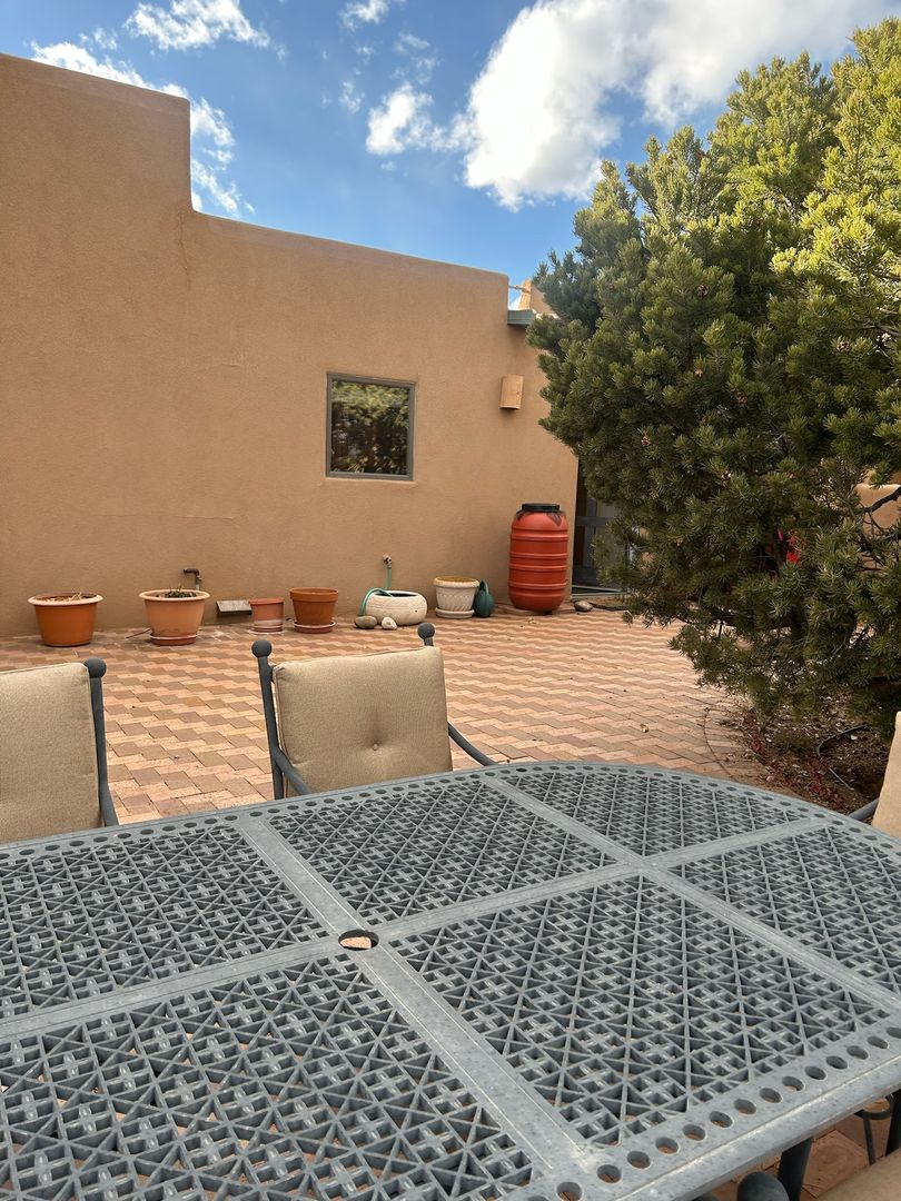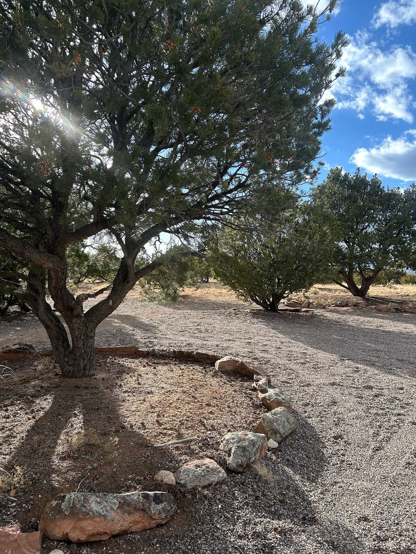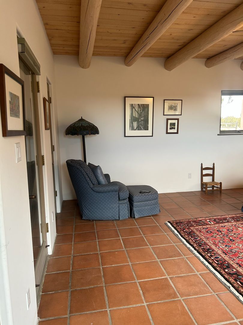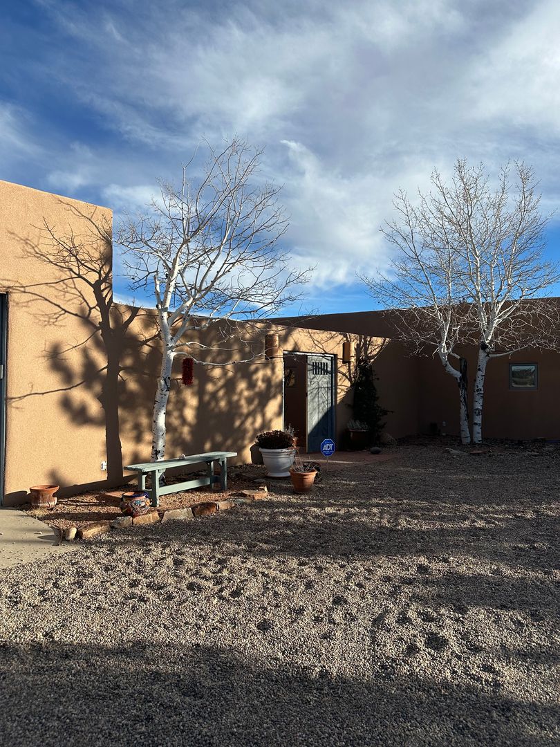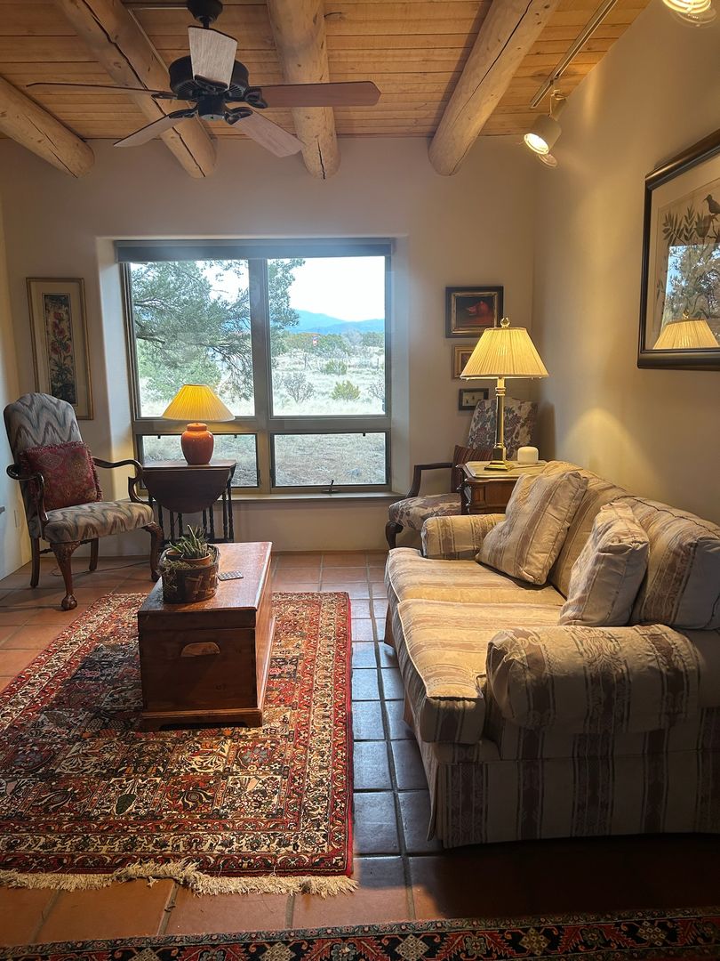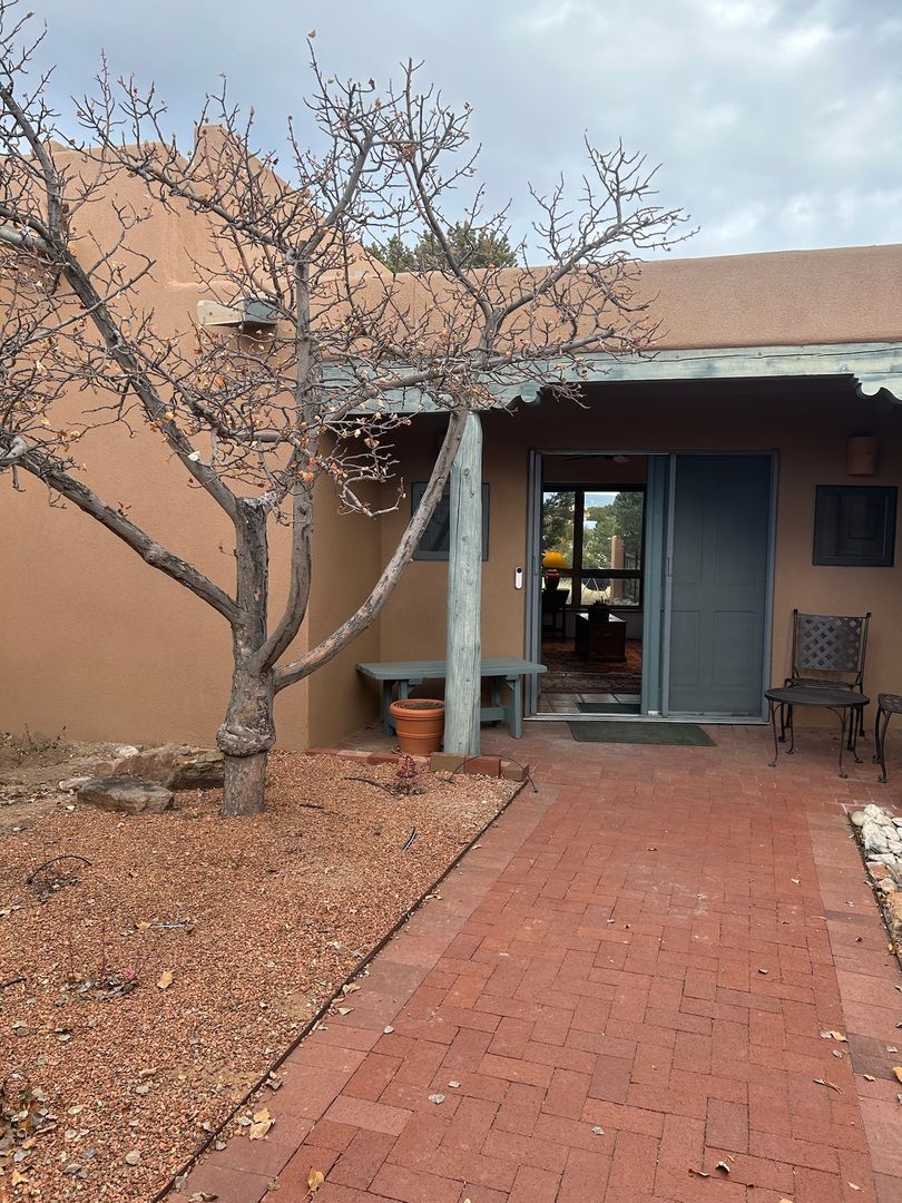 This charming Santa Fe-style stucco home features three bedrooms and two bathrooms, encompassing 2,280 square feet on a serene three-acre wooded lot. It includes an attached two-car garage, a cozy wood fireplace, and two secluded enclosed courtyards. The eastern courtyard and the living and dining areas offer stunning views of the Sangre de Cristo mountains, while the covered portal provides a perfect vantage point for the breathtaking sunsets over Sandia mountain.