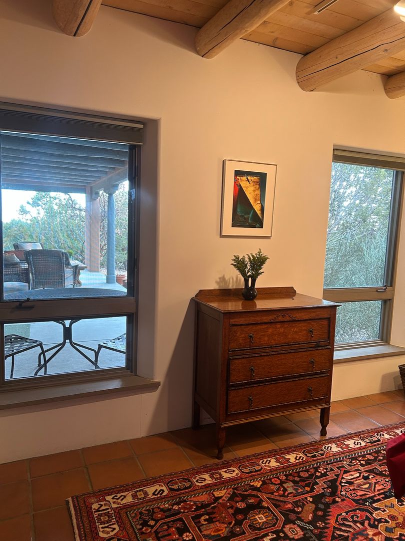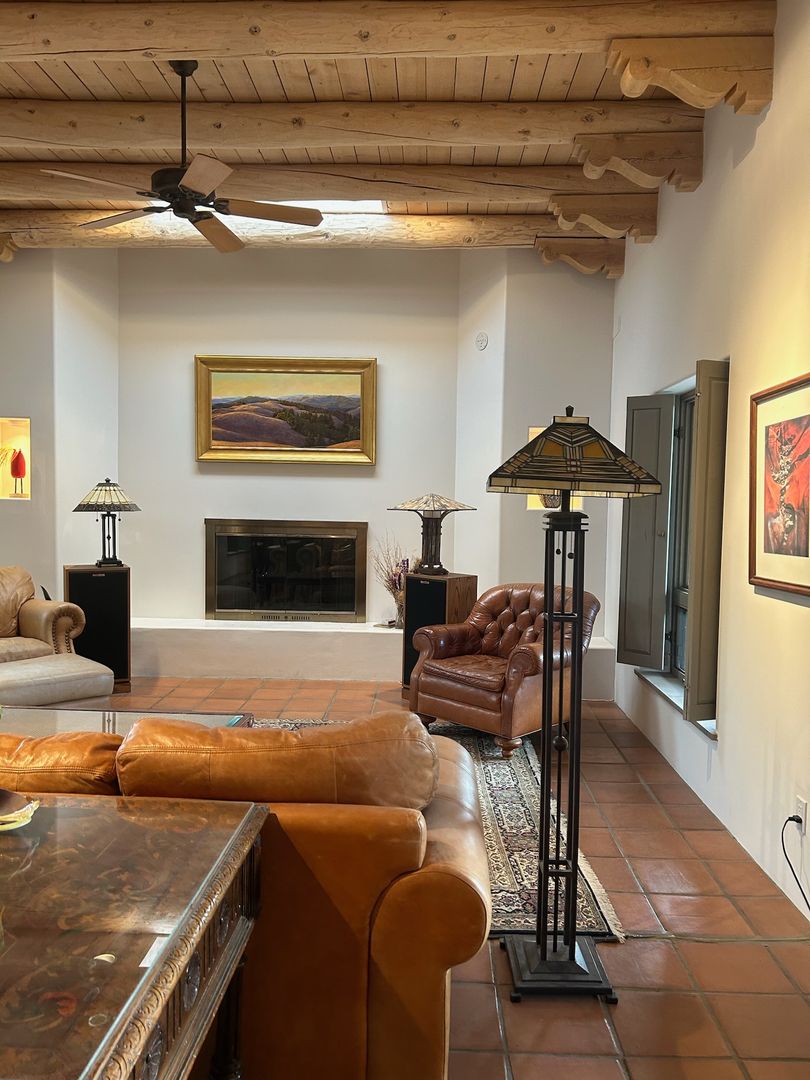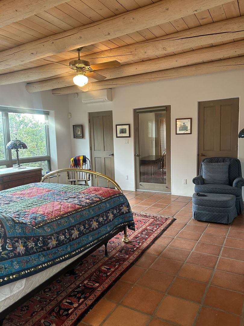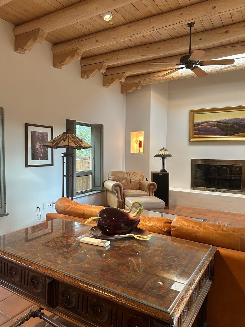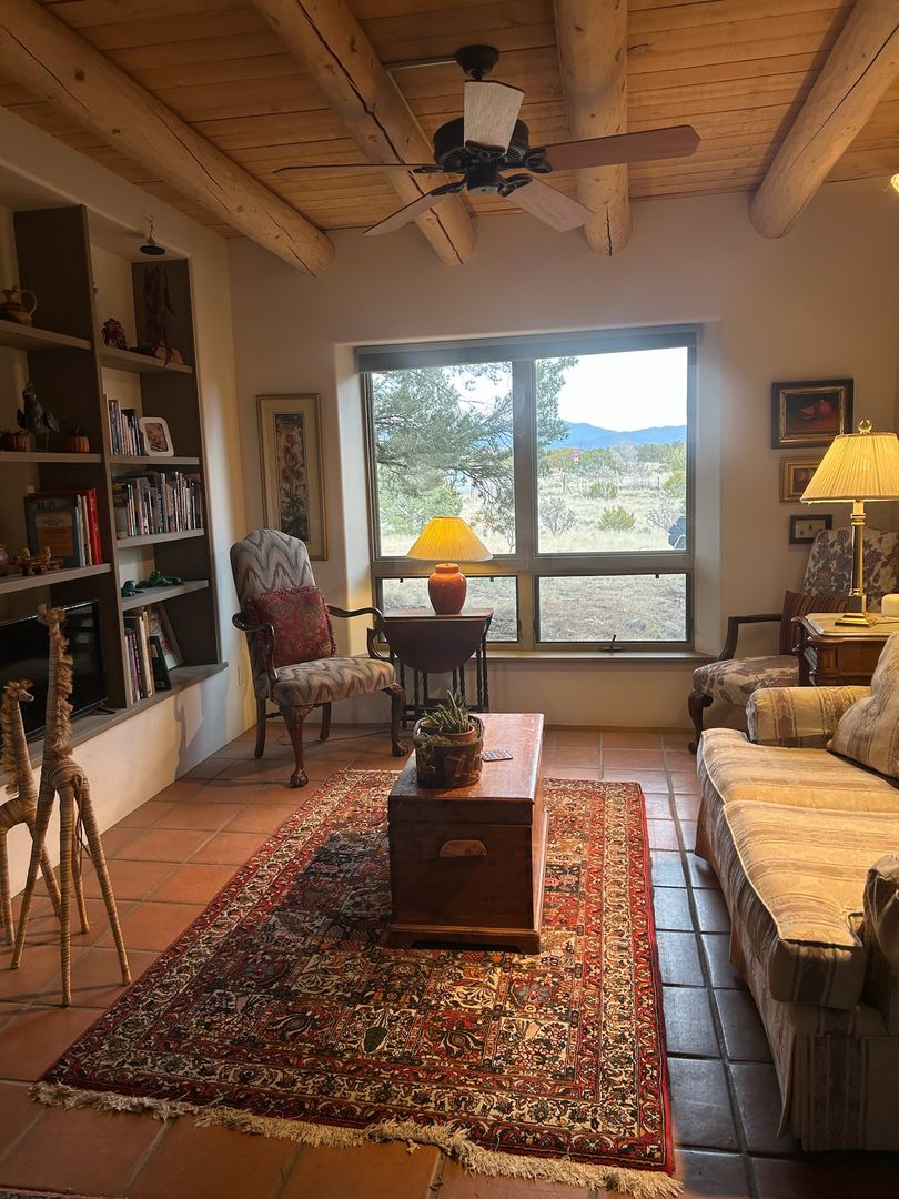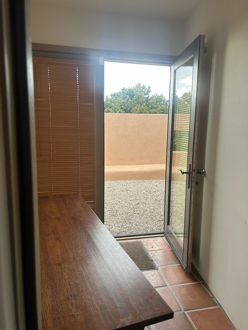 This charming Santa Fe-style stucco home features three bedrooms and two bathrooms, encompassing 2,280 square feet on a serene three-acre wooded lot. It includes an attached two-car garage, a cozy wood fireplace, and two secluded enclosed courtyards. The eastern courtyard and the living and dining areas offer stunning views of the Sangre de Cristo mountains, while the covered portal provides a perfect vantage point for the breathtaking sunsets over Sandia mountain.