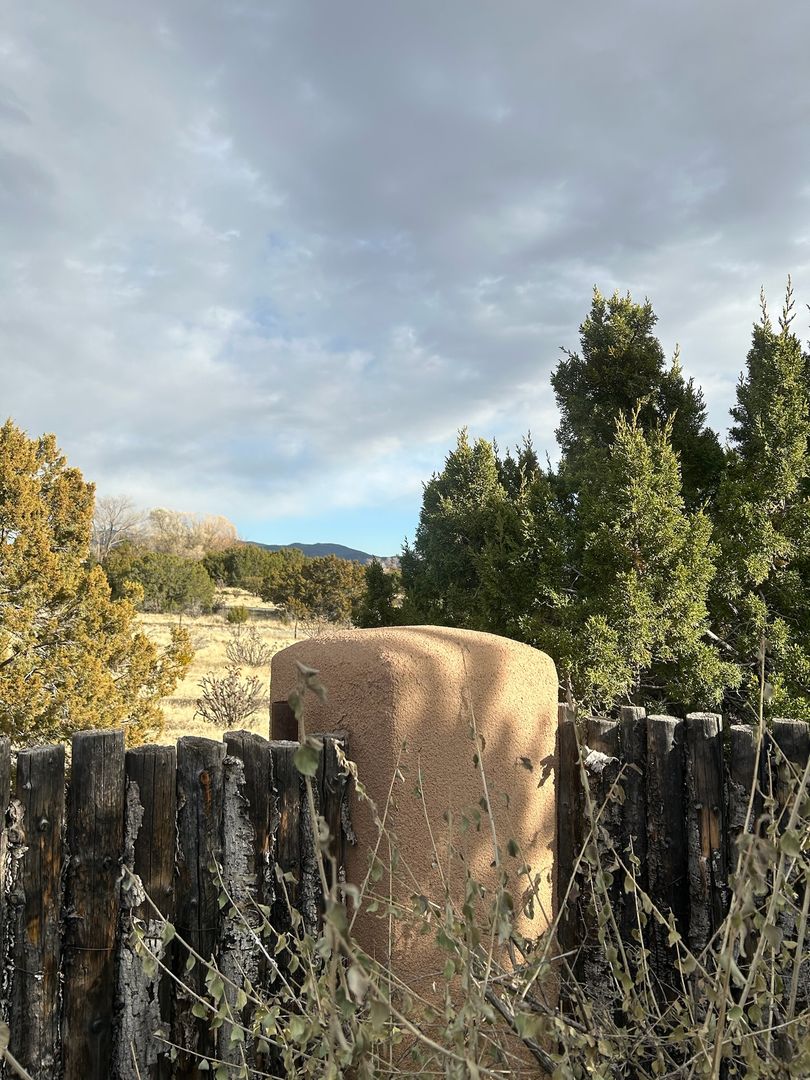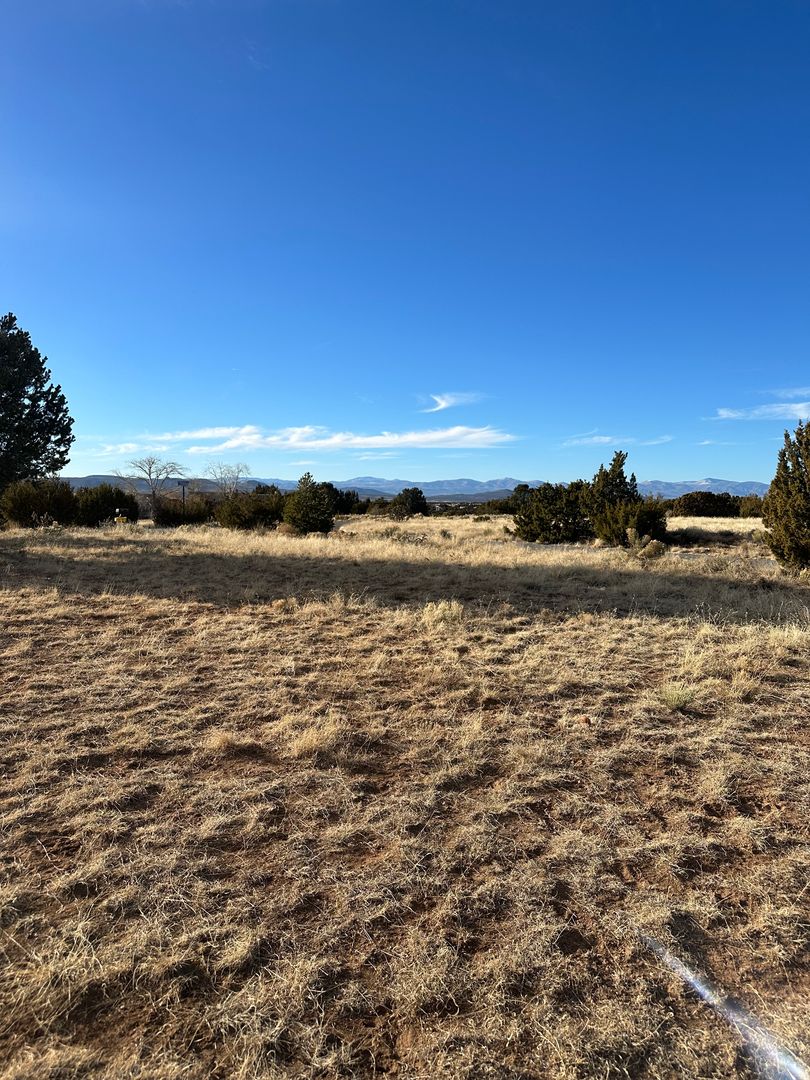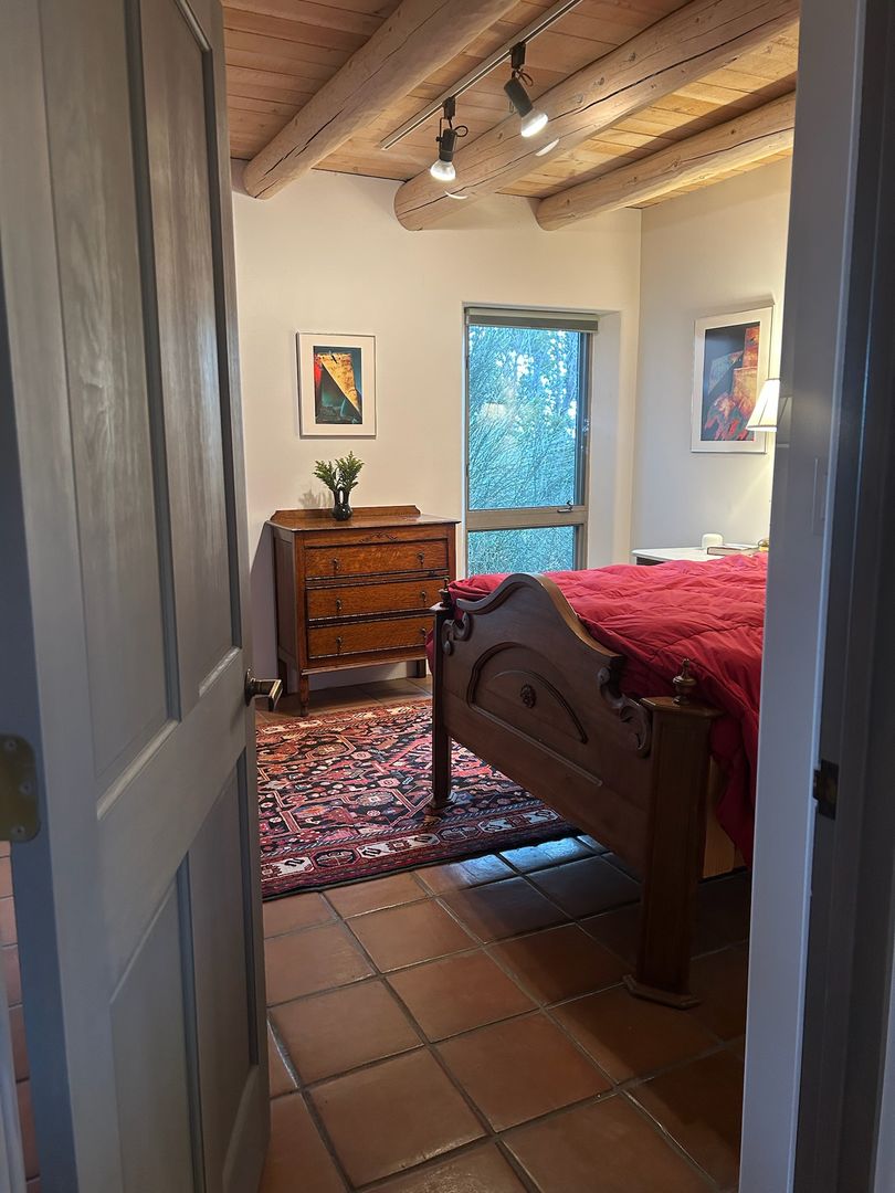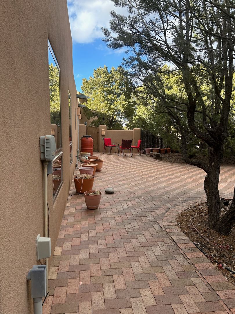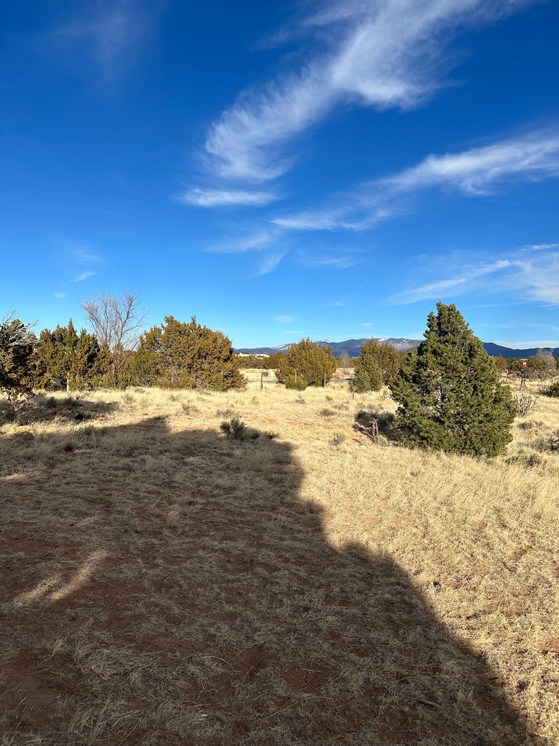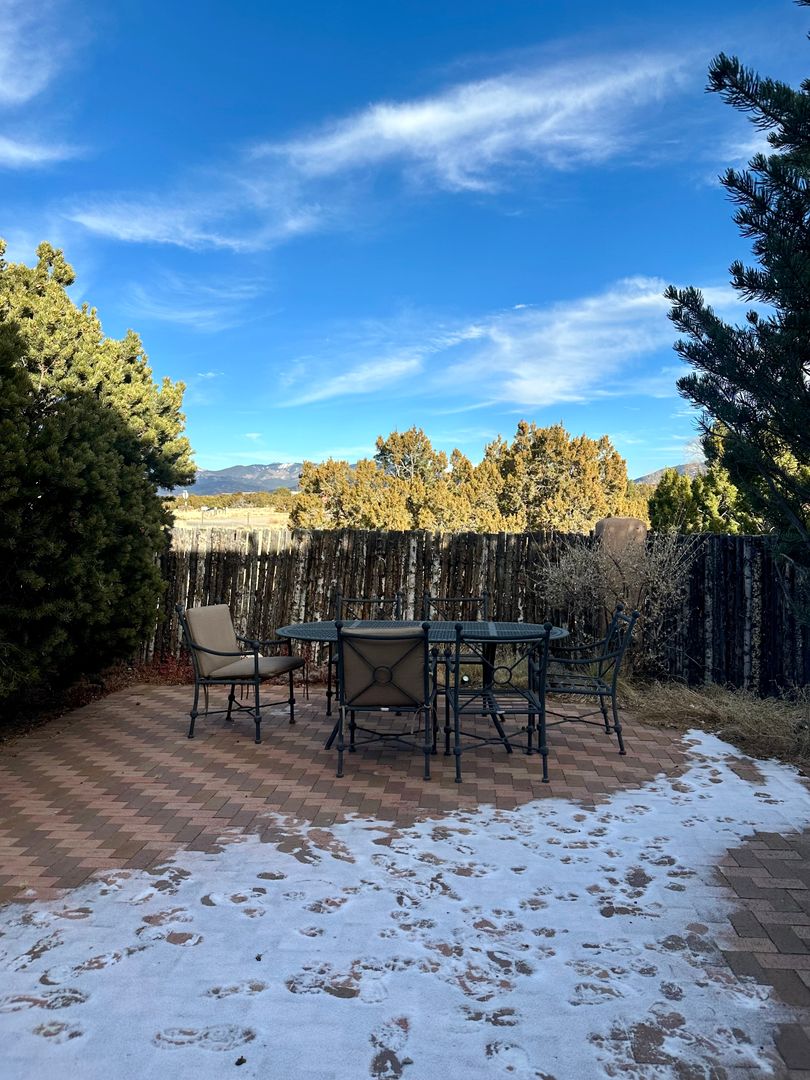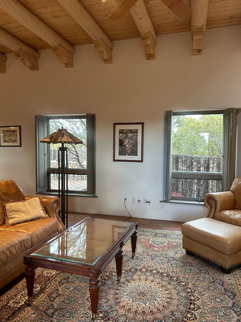 This charming Santa Fe-style stucco home features three bedrooms and two bathrooms, encompassing 2,280 square feet on a serene three-acre wooded lot. It includes an attached two-car garage, a cozy wood fireplace, and two secluded enclosed courtyards. The eastern courtyard and the living and dining areas offer stunning views of the Sangre de Cristo mountains, while the covered portal provides a perfect vantage point for the breathtaking sunsets over Sandia mountain.