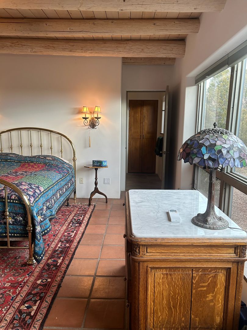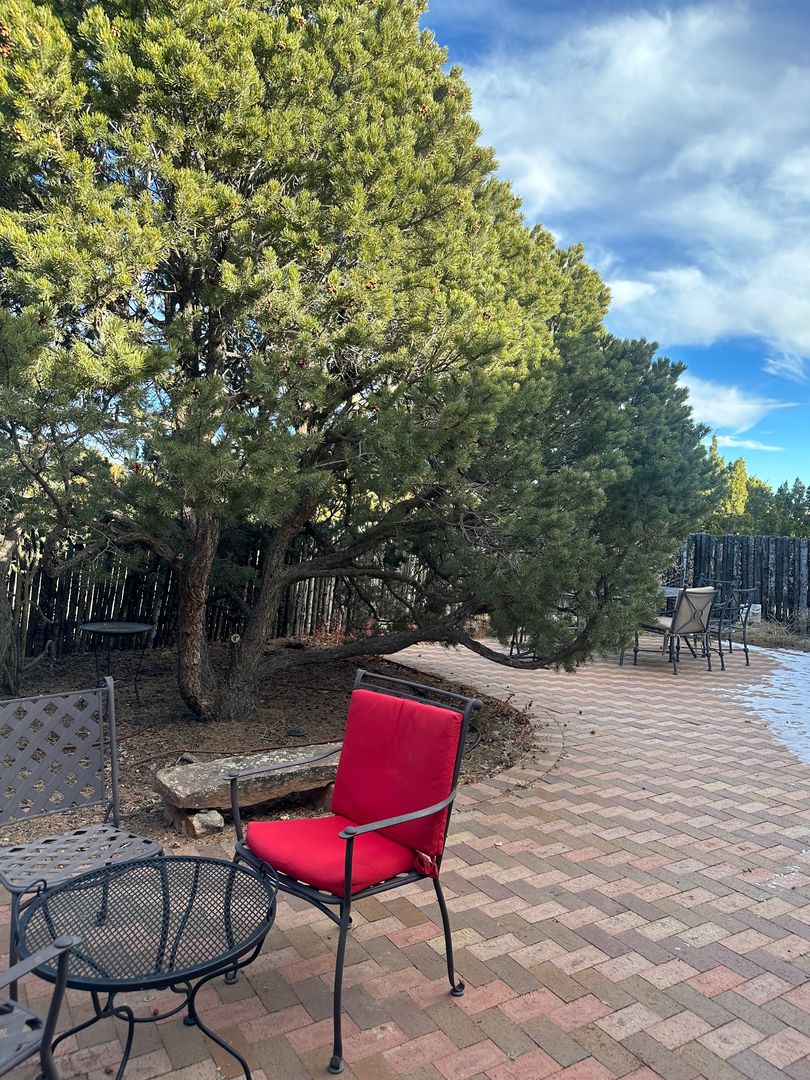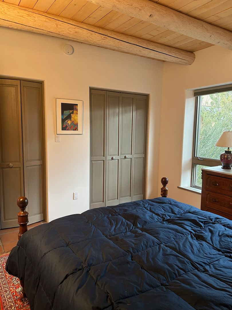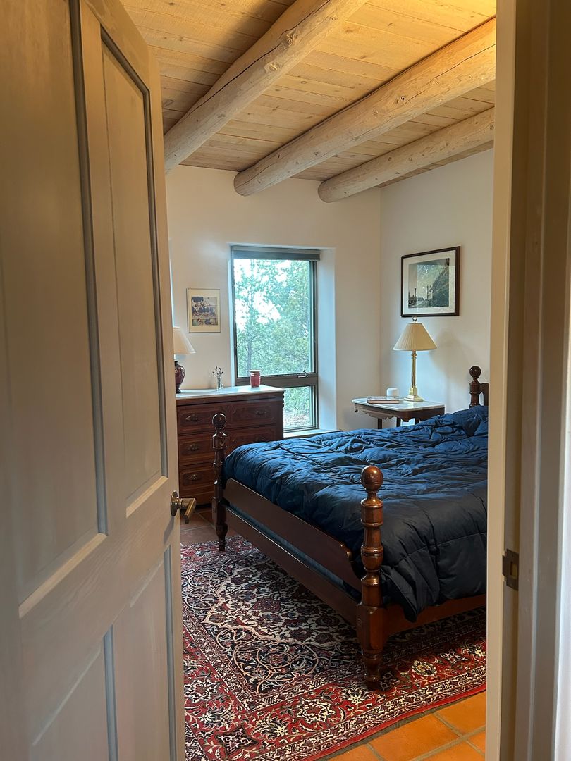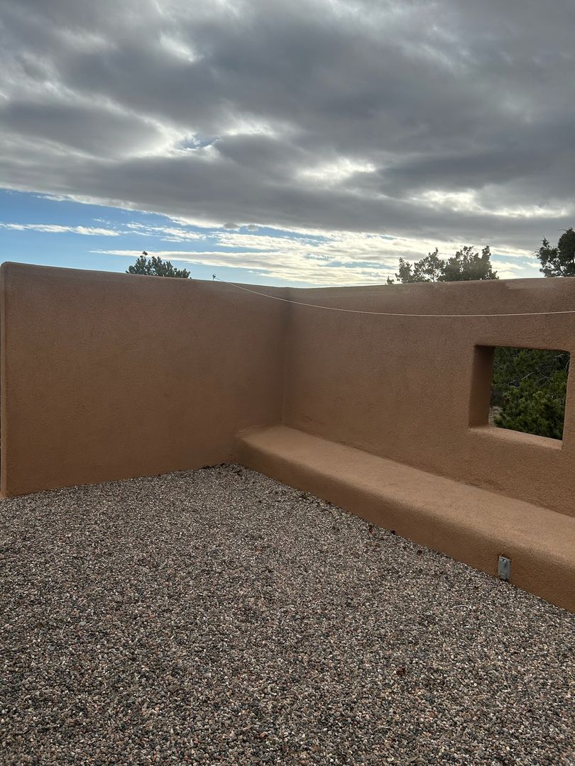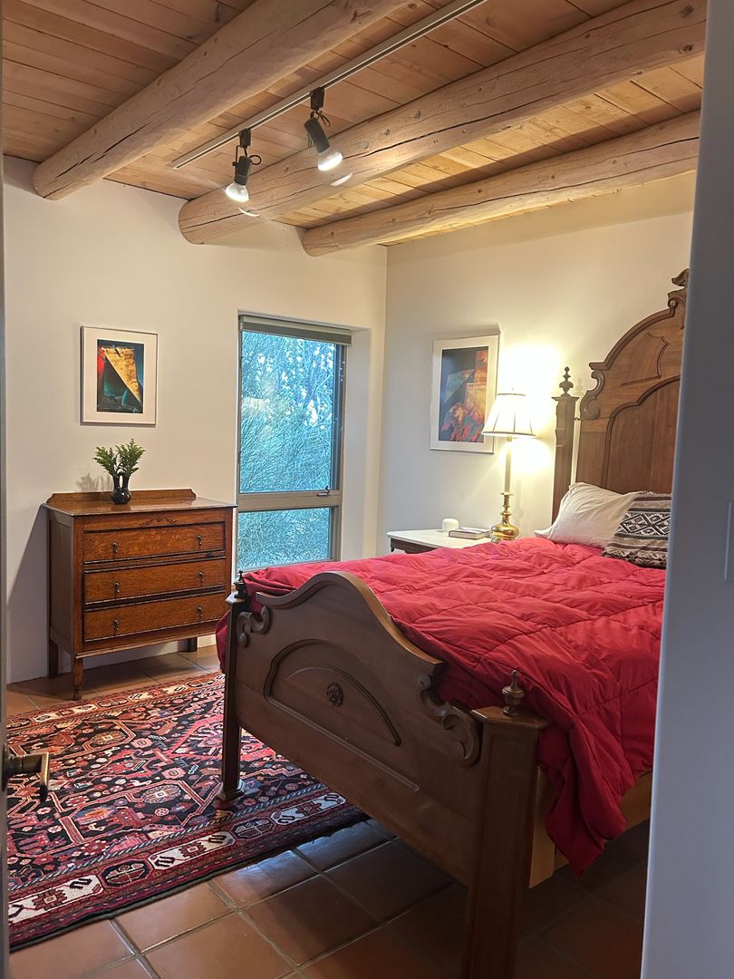 This charming Santa Fe-style stucco home features three bedrooms and two bathrooms, encompassing 2,280 square feet on a serene three-acre wooded lot. It includes an attached two-car garage, a cozy wood fireplace, and two secluded enclosed courtyards. The eastern courtyard and the living and dining areas offer stunning views of the Sangre de Cristo mountains, while the covered portal provides a perfect vantage point for the breathtaking sunsets over Sandia mountain.