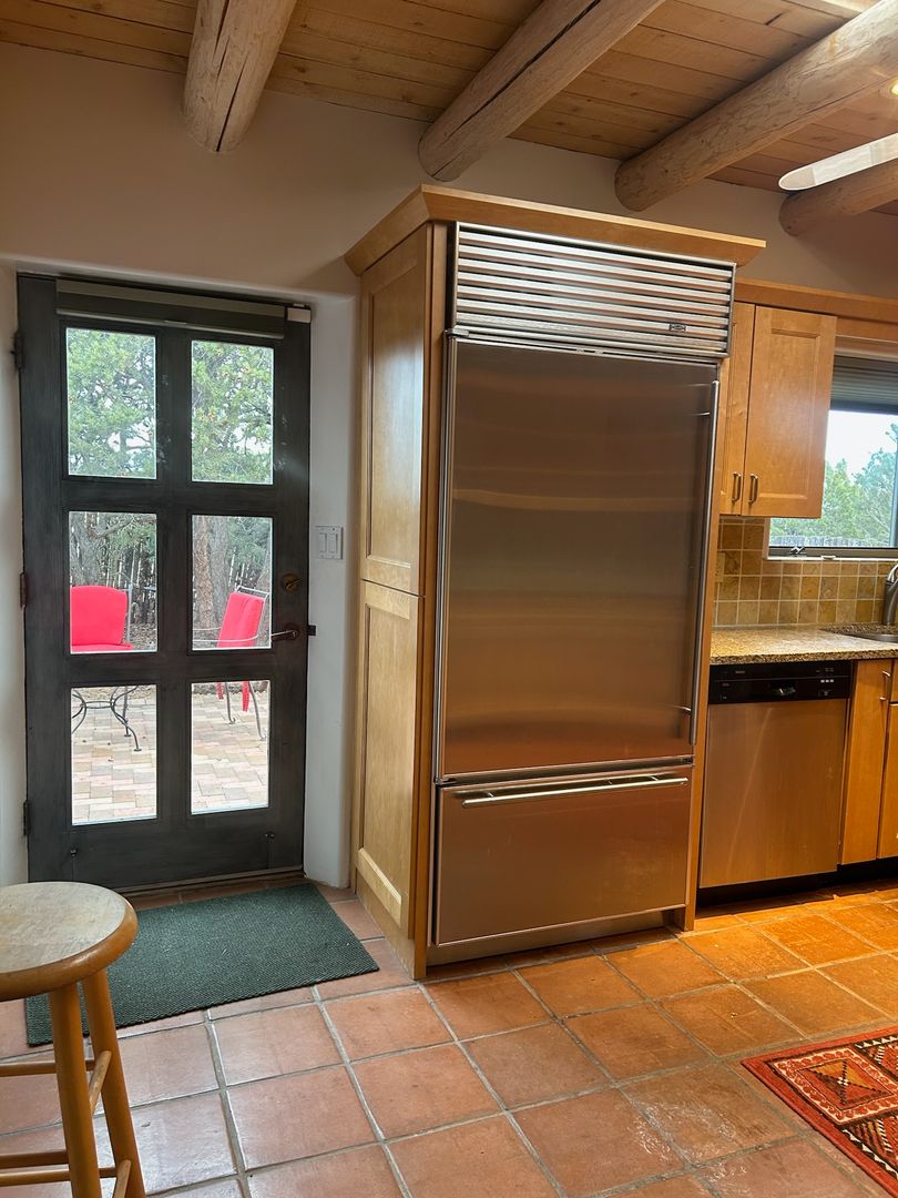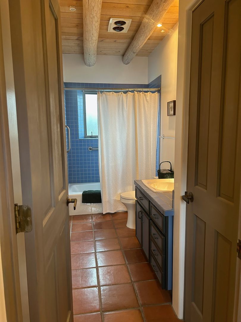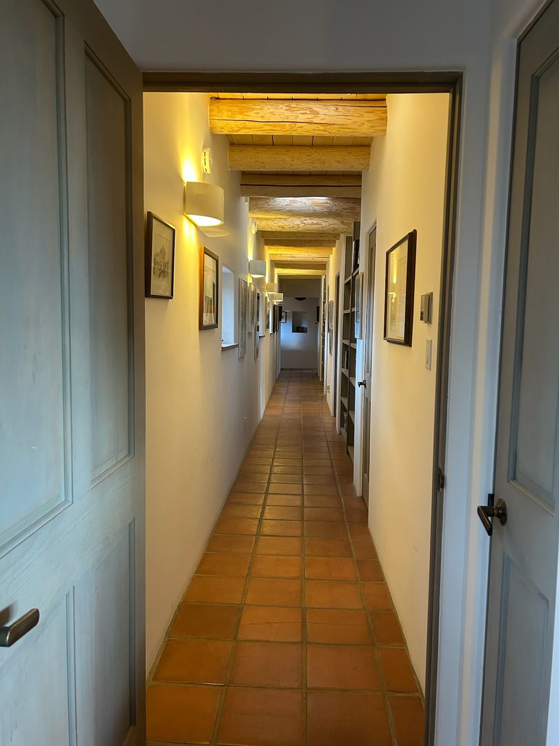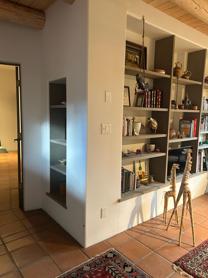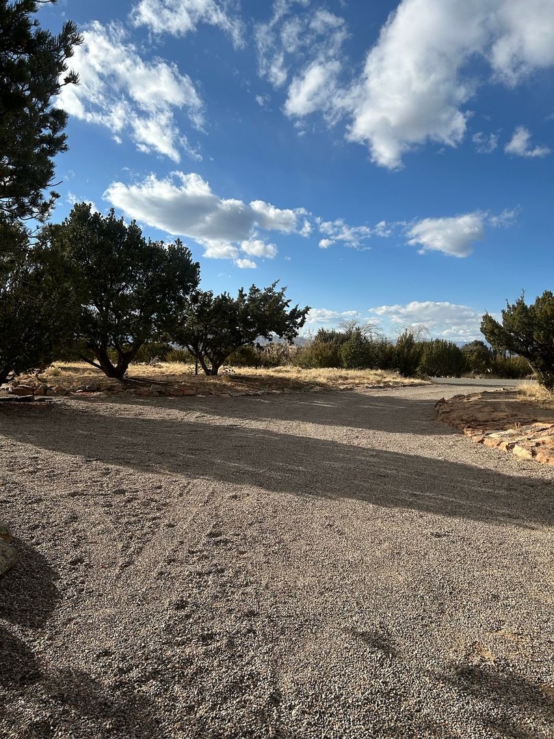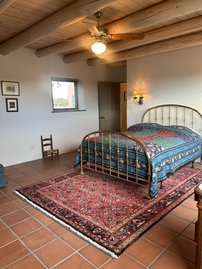 This charming Santa Fe-style stucco home features three bedrooms and two bathrooms, encompassing 2,280 square feet on a serene three-acre wooded lot. It includes an attached two-car garage, a cozy wood fireplace, and two secluded enclosed courtyards. The eastern courtyard and the living and dining areas offer stunning views of the Sangre de Cristo mountains, while the covered portal provides a perfect vantage point for the breathtaking sunsets over Sandia mountain.