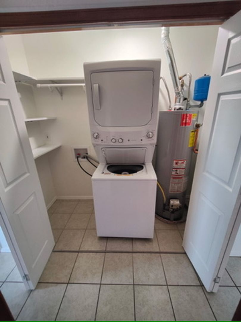 The interior includes an updated kitchen equipped with a refrigerator, stove/oven, and dishwasher. The unit also includes a stackable washer and dryer in a dedicated in-unit laundry area. Updated window treatments give the home a clean, finished feel. Both bedrooms are well-sized and offer flexible use for sleeping, office space, or guests.
